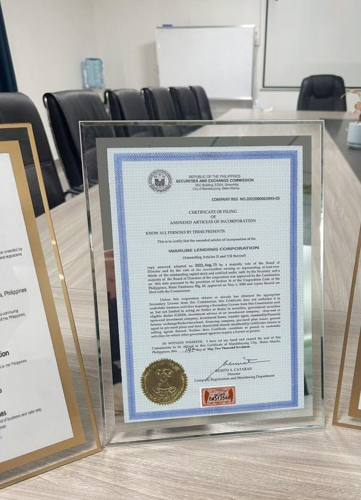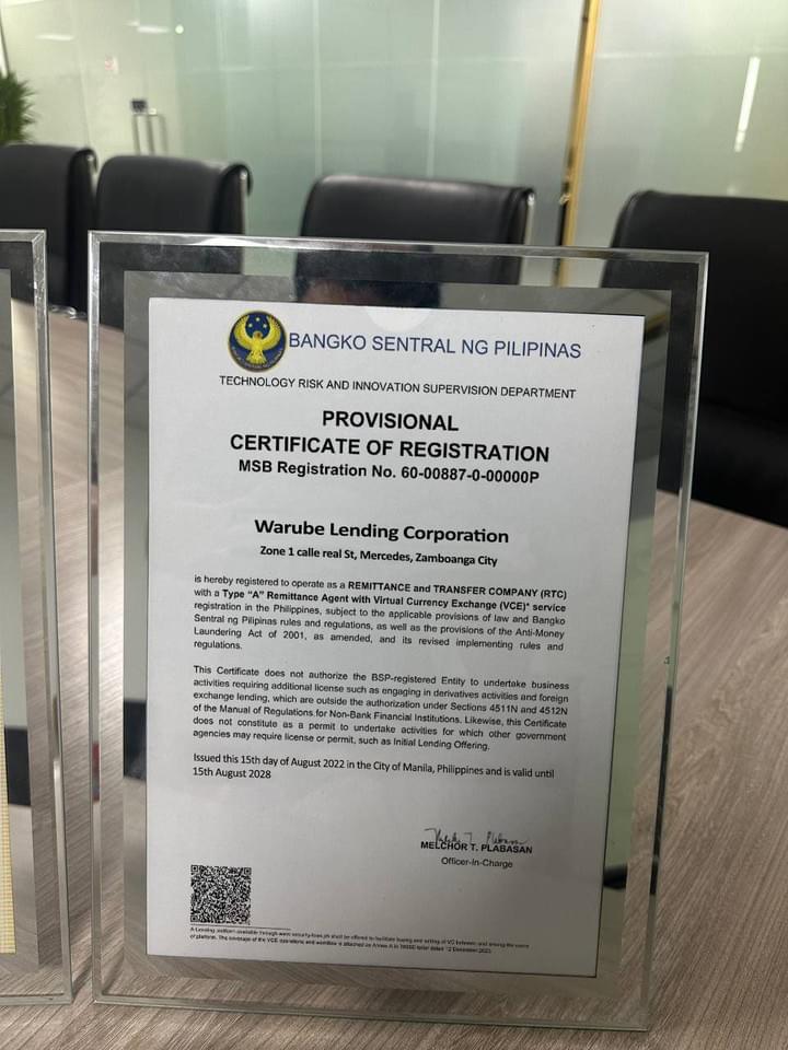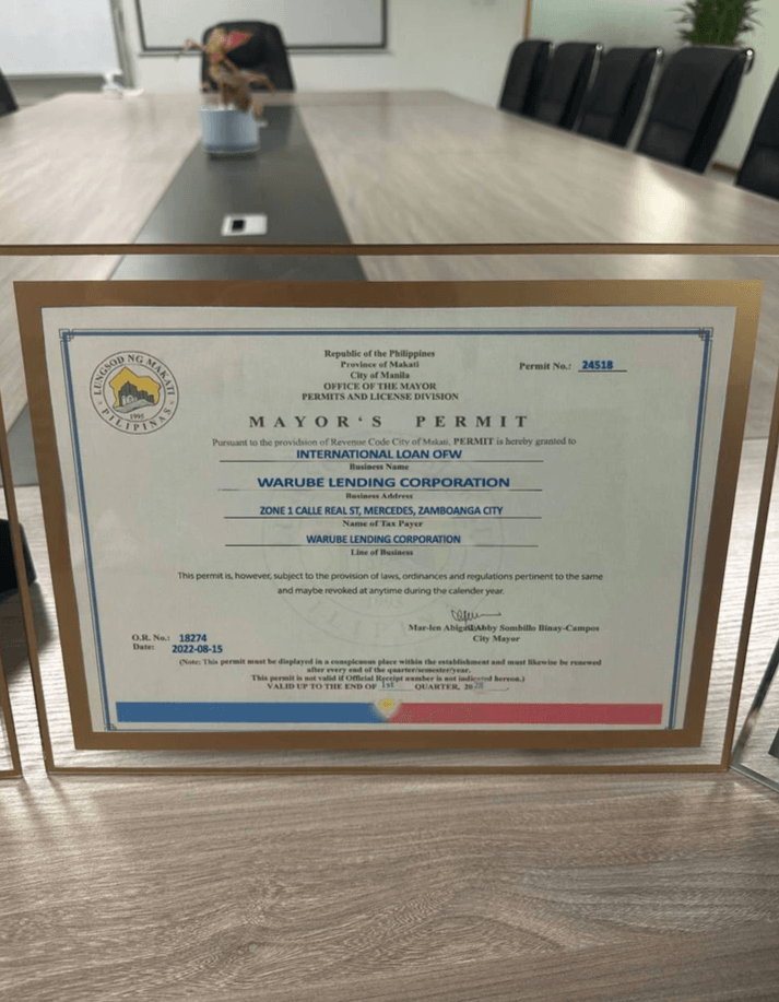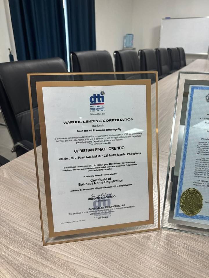 Warube Lending Corporation, the Department of Trade and Ind ustry (DTI), ensuring our operations comply with all local business regulations and standards.